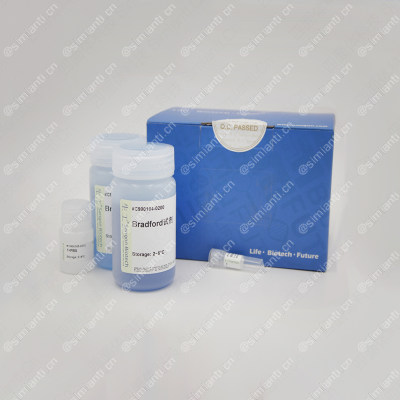 Bradford试剂蛋白定量是一种快速、即用型的总蛋白光学定量方法。在酸性条件下,考马斯亮蓝G-250染料与蛋白质疏水区结合,导致最大吸收峰由465 nm变为595 nm,同时颜色也由棕色变为蓝色,该蓝色化合物颜色的深浅与蛋白质浓度的高低成正比关系。将蛋白质样品或稀释的BSA与Bradford试剂混合,测量在595 nm处的吸收值,在由一系列稀释的BSA建立的标准曲线的情况下,蛋白质的浓度可以根据标准曲线而确定。