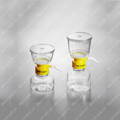 真空式过滤器由透明高分子材料聚苯乙烯(GPPS)制成,利用真空泵提供压力差,用于组织培养液和其他实验室流体溶液的大量过滤,样品处理量可达数升,过滤后的样品可直接以无菌的收集瓶保存。