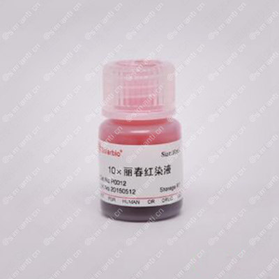 丽春红(Ponceau S)也称猩红,可以用于PVDF膜、硝酸纤维素膜(nitrocellulose membrane)和醋酸纤维素膜(cellulose acetate membrane)上的蛋白的检测。丽春红带负电荷,可以与带正电荷的氨基酸残基结合,同时丽春红也可以与蛋白的非极性区相结合,从而形成红色的条带。丽春红染色的灵敏度不及考马斯亮蓝染色。丽春红对蛋白的染色是可逆的,染色后可以用蒸馏水,PBS或其它适当溶液洗去。因此,蛋白质N端测序时将SDS-PAGE胶上的蛋白转移到PVDF膜,用丽春红染色后将目的条带切下用于测序。
